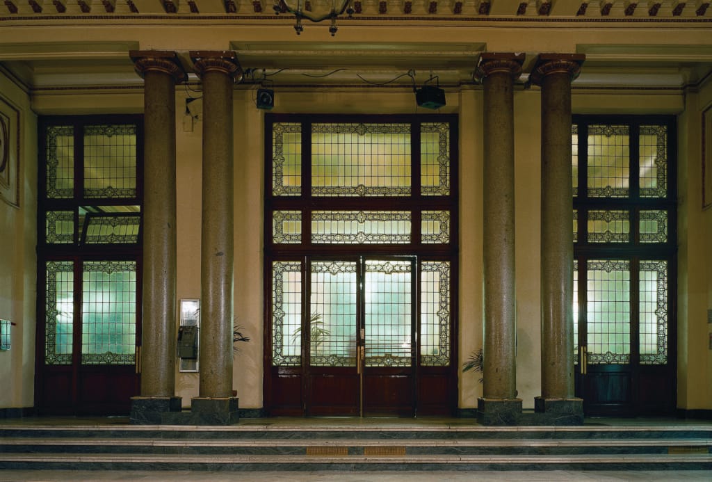Escaleras interiores del edificio y vista de las vidrieras