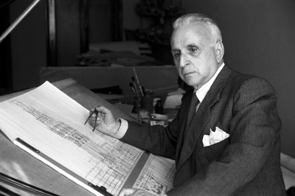 Antonio Palacios en su estudio de Madrid, el 15 de diciembre de 1924. Trabajando con los planos del proyecto del edificio para el Círculo de Bellas Artes. Agencia EFE